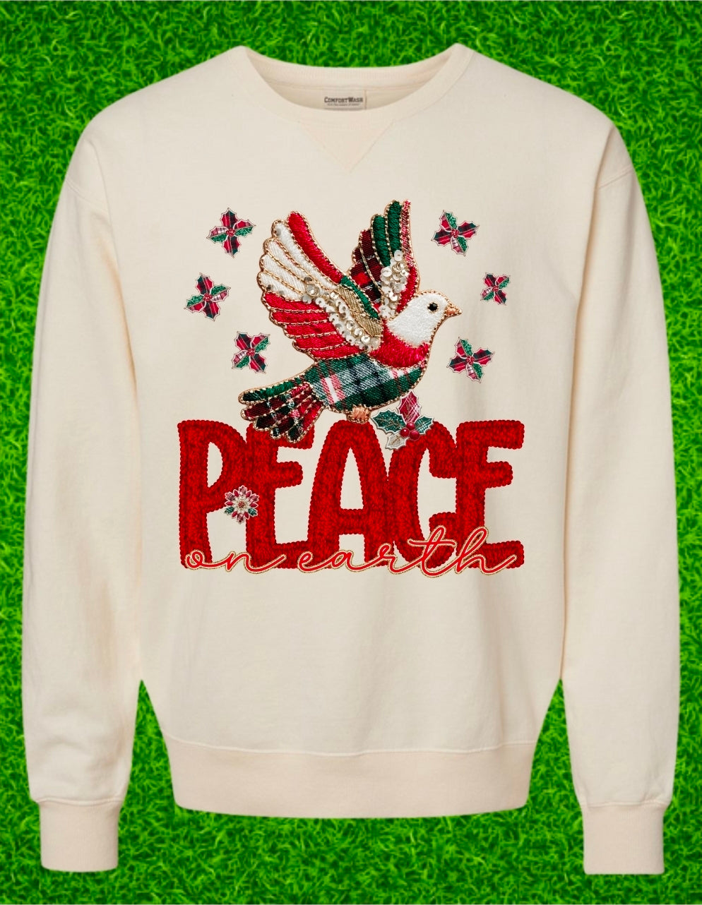 Celebrate the season with the message we all need — Peace on Earth. This elegant sweatshirt features a beautifully detailed dove carrying holly leaves, surrounded by delicate accents and shimmering touches that bring the artwork to life.