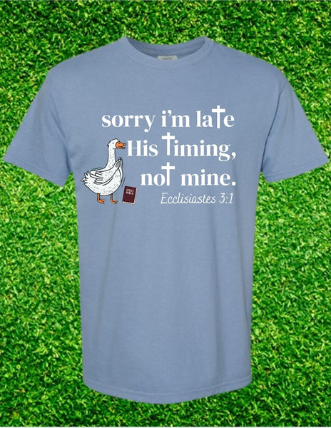 These “Sorry I’m Late – His Timing, Not Mine” tees are the perfect mix of faith and humor, reminding us of Ecclesiastes 3:1 — “To everything there is a season.” Featuring an adorable goose holding the Holy Bible, this comfy tee is a great conversation starter and a sweet reminder to trust God’s plan. Available in multiple colors and sizes, it’s perfect for casual days, Bible study, or gifting to your favorite Jesus-loving friend.