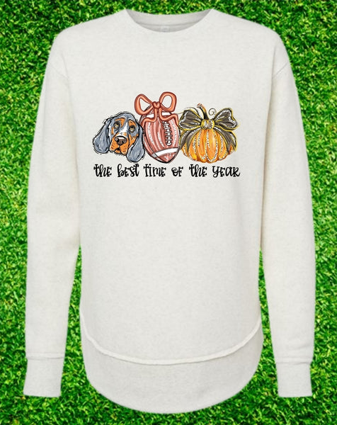 This cozy cream-colored sweatshirt features the ultimate trio of fall favorites – a lovable hound dog, a football wrapped in a bow, and a glittery pumpkin – all hand-drawn with a touch of Southern charm. Topped with the phrase "the best time of the year," it's the perfect piece for dog lovers, football fans, and pumpkin spice queens alike. Whether you're cheering on your team or picking pumpkins with your littles, this one brings all the fall vibes!