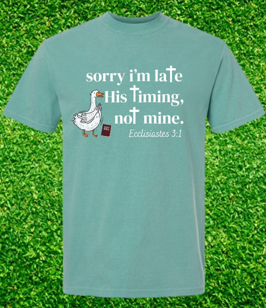 These “Sorry I’m Late – His Timing, Not Mine” tees are the perfect mix of faith and humor, reminding us of Ecclesiastes 3:1 — “To everything there is a season.” Featuring an adorable goose holding the Holy Bible, this comfy tee is a great conversation starter and a sweet reminder to trust God’s plan. Available in multiple colors and sizes, it’s perfect for casual days, Bible study, or gifting to your favorite Jesus-loving friend.