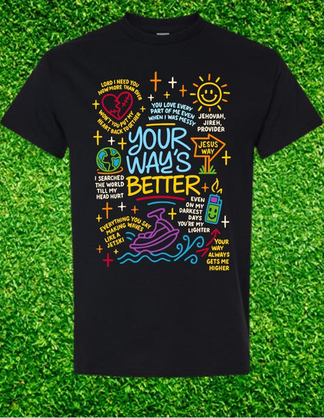 Bold, colorful, and packed with truth—our Your Way’s Better tee is a joyful reminder that God’s way is always best. The front features a simple chest print, while the back bursts with vibrant graphics and uplifting phrases pointing to Jesus as our hope, provider, and guide. Made from soft, breathable cotton for all-day comfort.